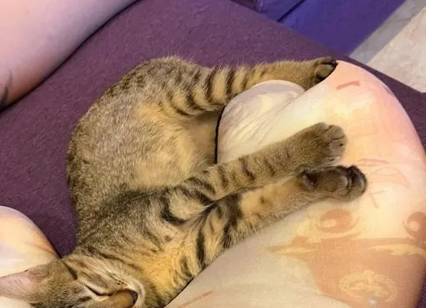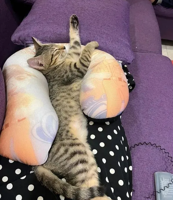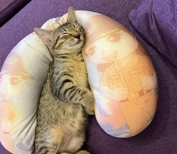 它先是用脑袋蹭了蹭枕头上的卡通图案,然后熟练地把身体往 U 型的弧度里一塞,爪子搭在 “人物” 的肩膀上,眼睛一闭,直接进入了深度睡眠模式。