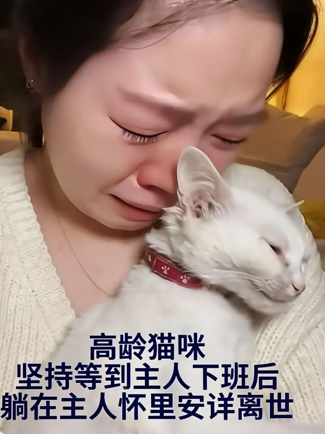 主人下班推门而入,白猫用尽生命最后一丝力气,缓缓起身,轻轻蹭了蹭主人的手。随后便在主人温暖的怀里,安心地闭上了眼睛。
