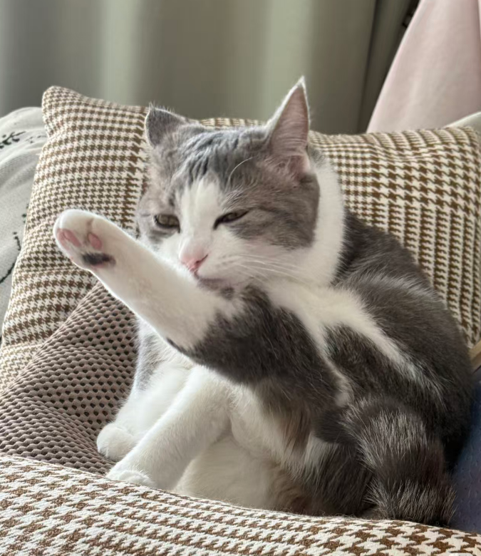 有没有发现,你凶完猫咪后,它会突然原地坐下,对着自己的爪子或尾巴疯狂舔毛?我之前还吐槽,都闯祸了还有心思打理毛发。