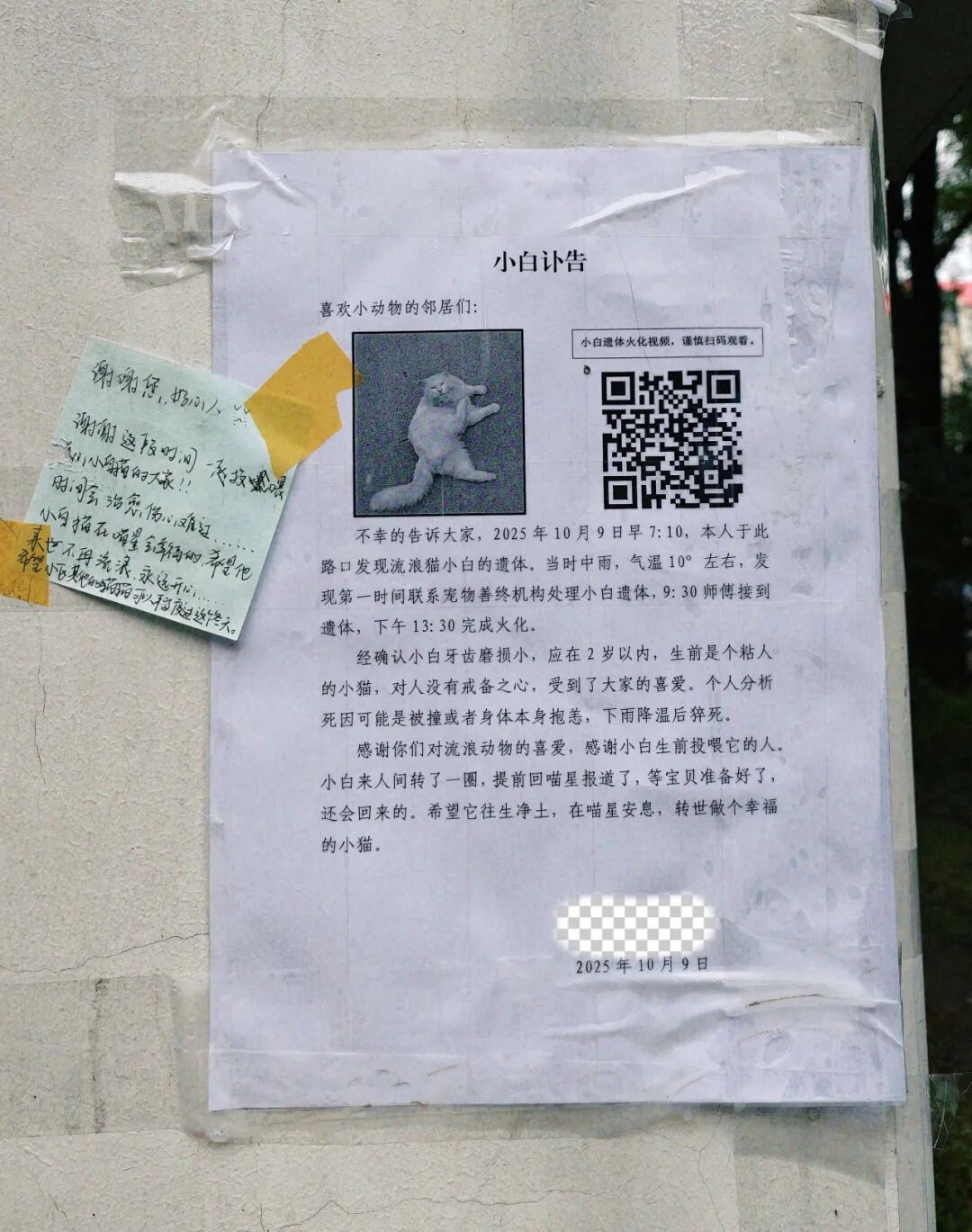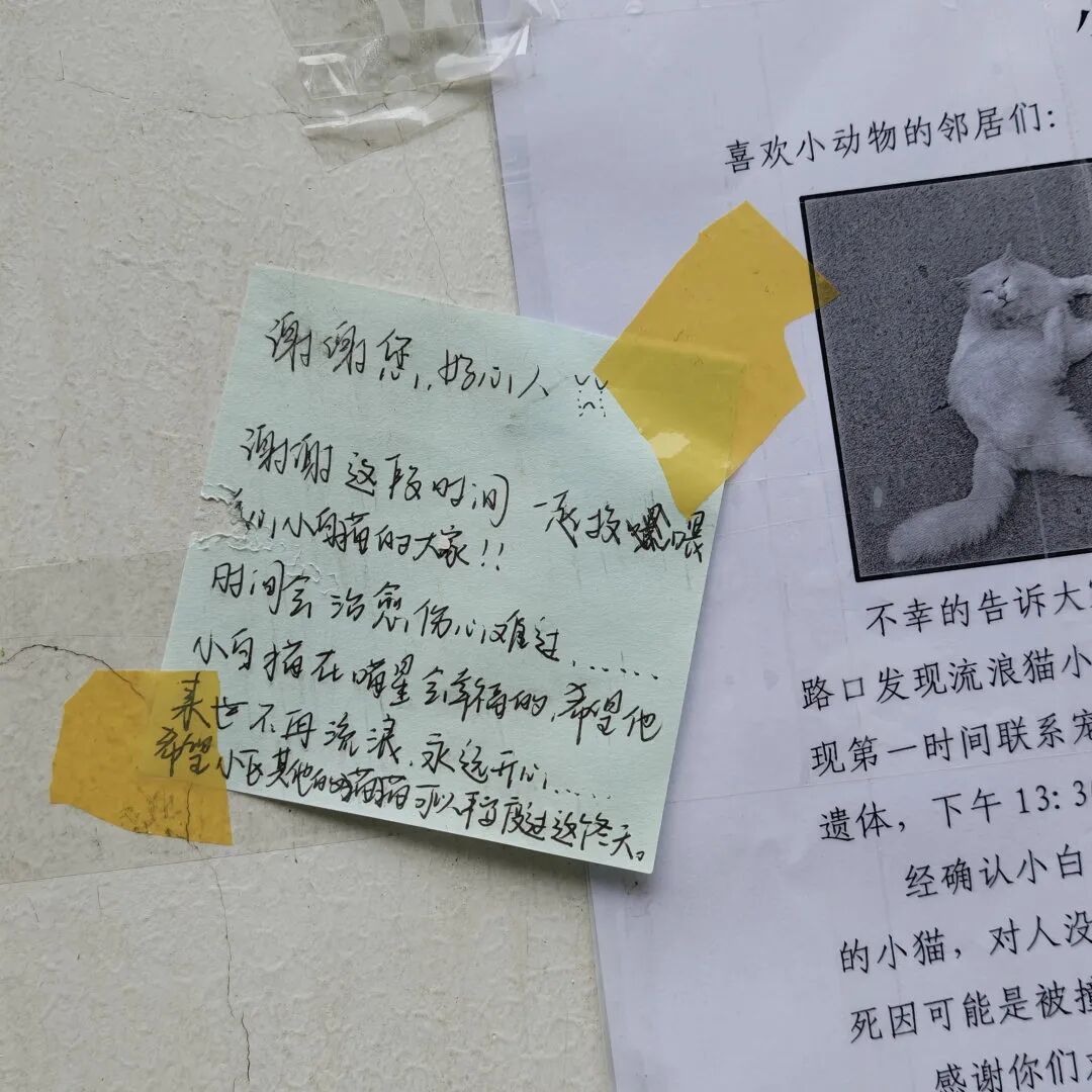 我还在小白常待的地方贴了讣告,告诉所有投喂过小白、喜欢小白的邻居,我们的小白,永远离开了。讣告的边角贴了邻居的留言,一笔一划,都是藏不住的惋惜:>“谢谢您,好心人,谢谢这段时间,一起投喂小白猫的大家!!时间会治愈伤心难过......小白猫在喵星会幸福的,希望它来时不再流浪,永远开心,希望小区其他的猫猫可以平安度过这个冬天”。