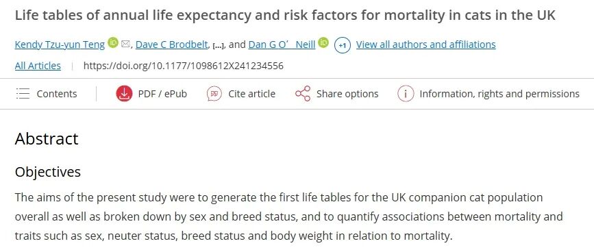 本月初,JFMS的一篇新文章非常有趣。针对十多个品种的猫的生命表(life table)进行了调研总结,结果非常得… 让人纠结。根据本次和历届研究,针对猫性别对寿命的影响,绝育是否能更长寿,各品种寿命差异都有所解答。