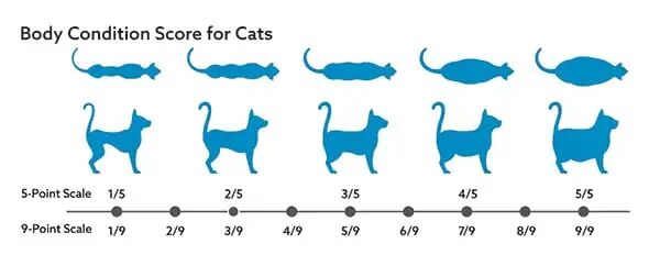衡量猫的胖瘦靠的是BCS分数系统,一种是5分制,一种是9分制,数字越大越胖。