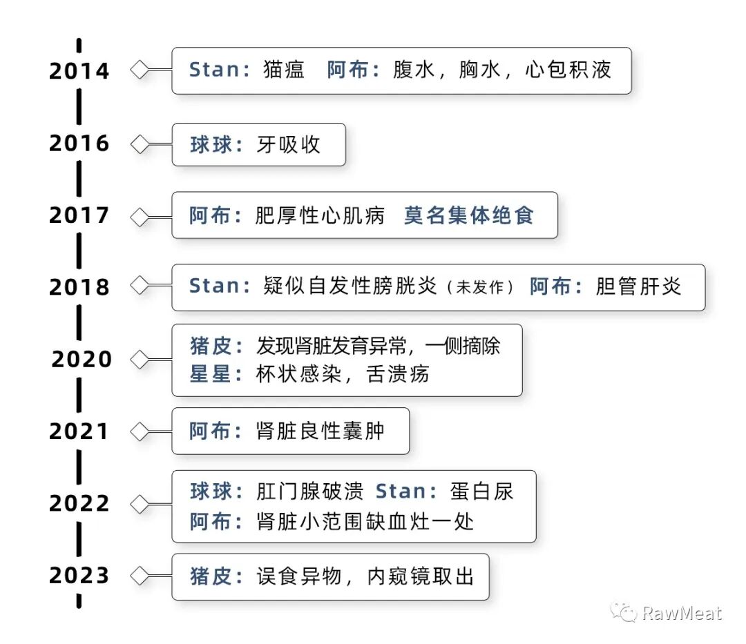 7岁起猫开始变老,10岁就是身体机能明显下降、疾病高发的分水岭,前阵子刚好带孩子们去做了体检,我稍微絮叨下近些年猫出现的问题,以及体检时我个人关注的一些点,权当一个记录、回顾。
