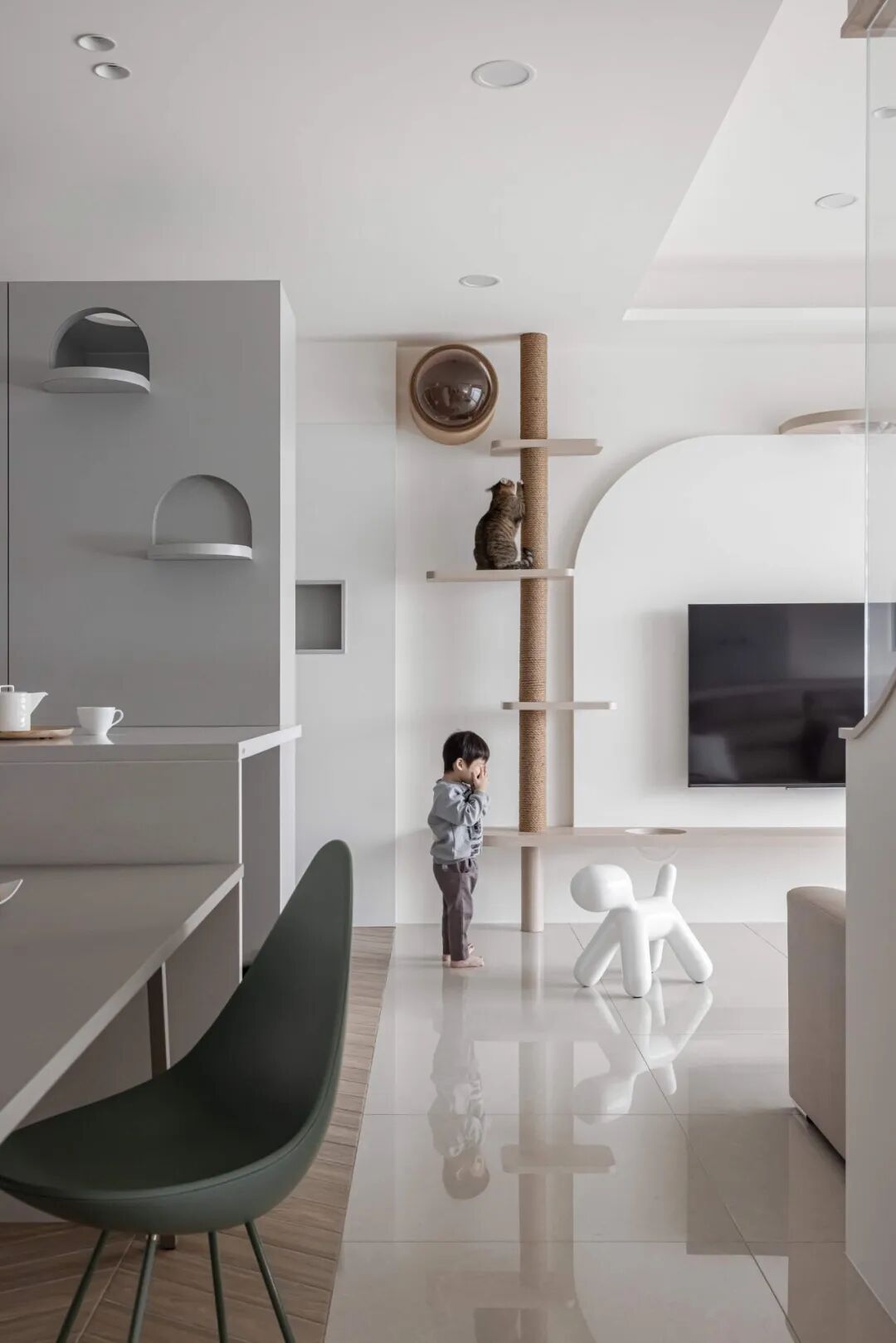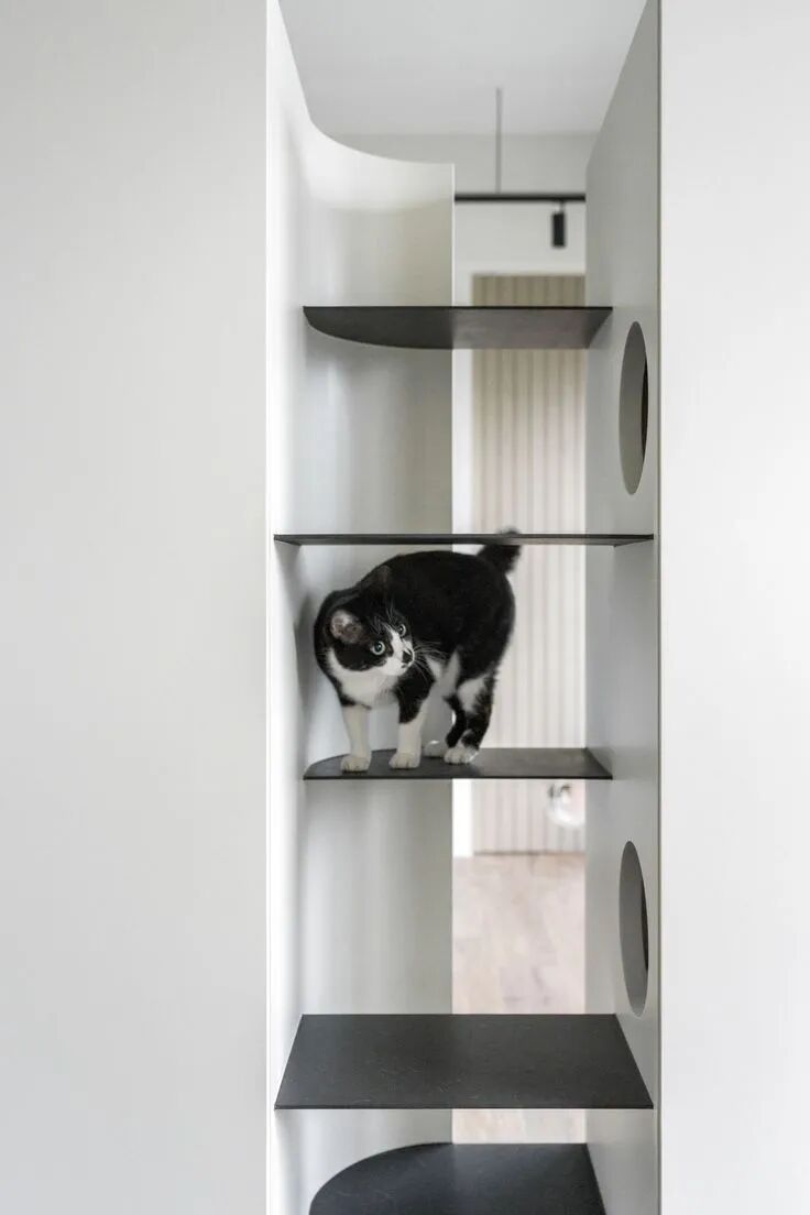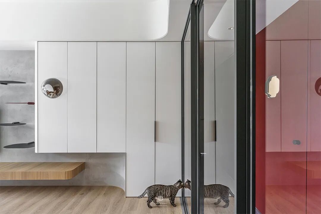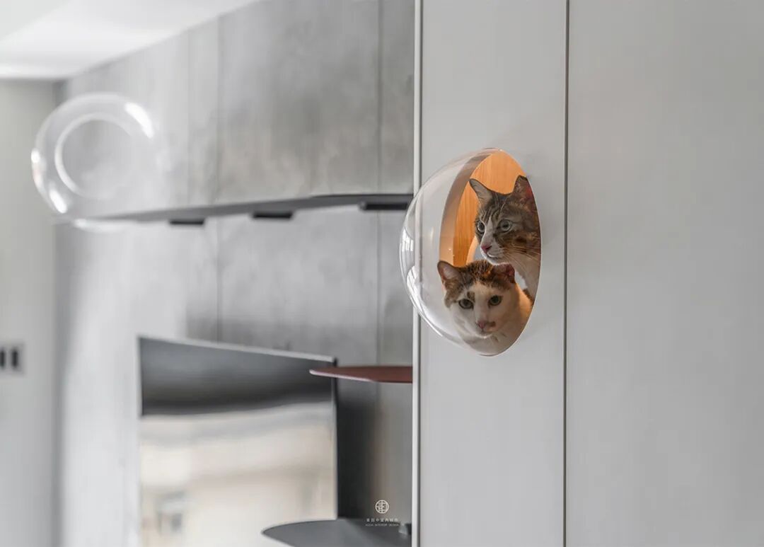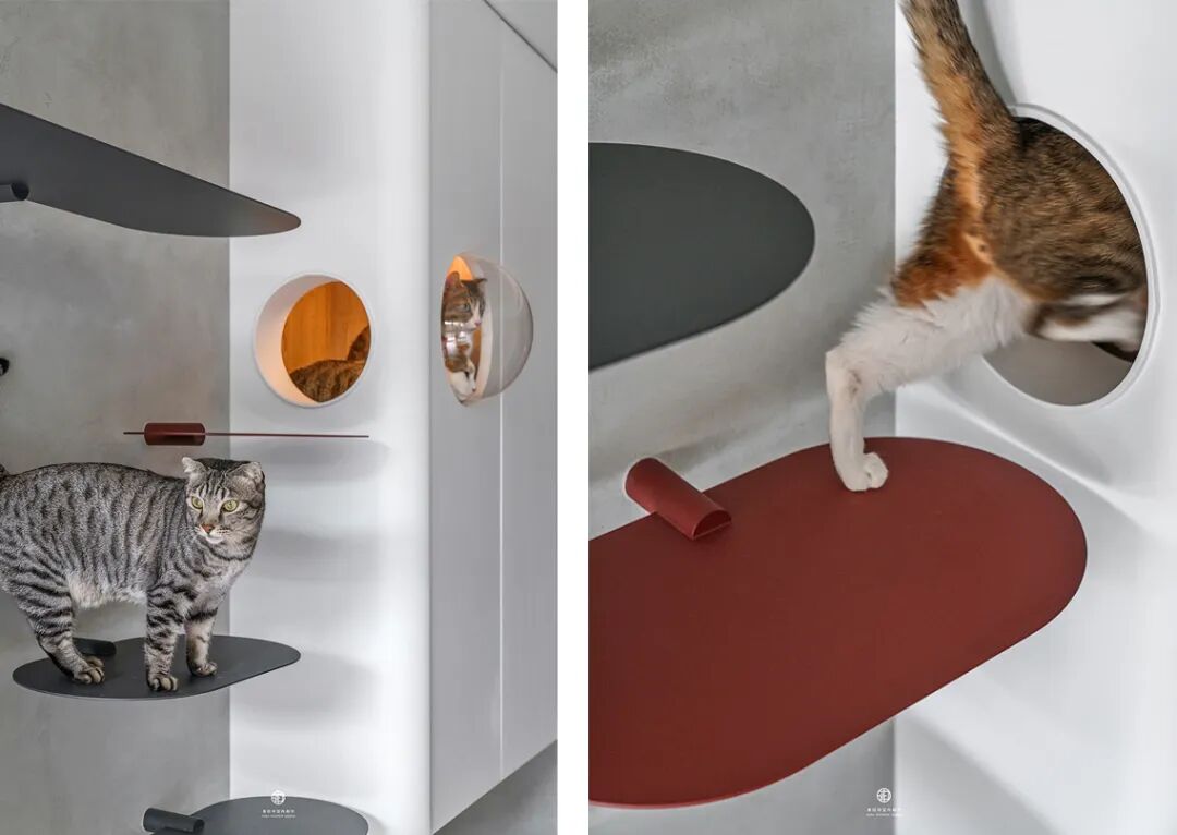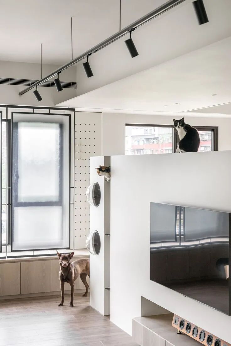 最妙的是那些“长在墙上”的宠物设施——电视墙延伸出的层板书架,自然变成了猫咪的攀爬阶梯和瞭望台;纯白墙面上,嵌着供猫咪穿梭的镂空猫洞和专属步道。这些设计不是后加的玩具,而是住宅结构的一部分,美观又实用,真正把宠物的需求“编织”进了日常生活的肌理里。