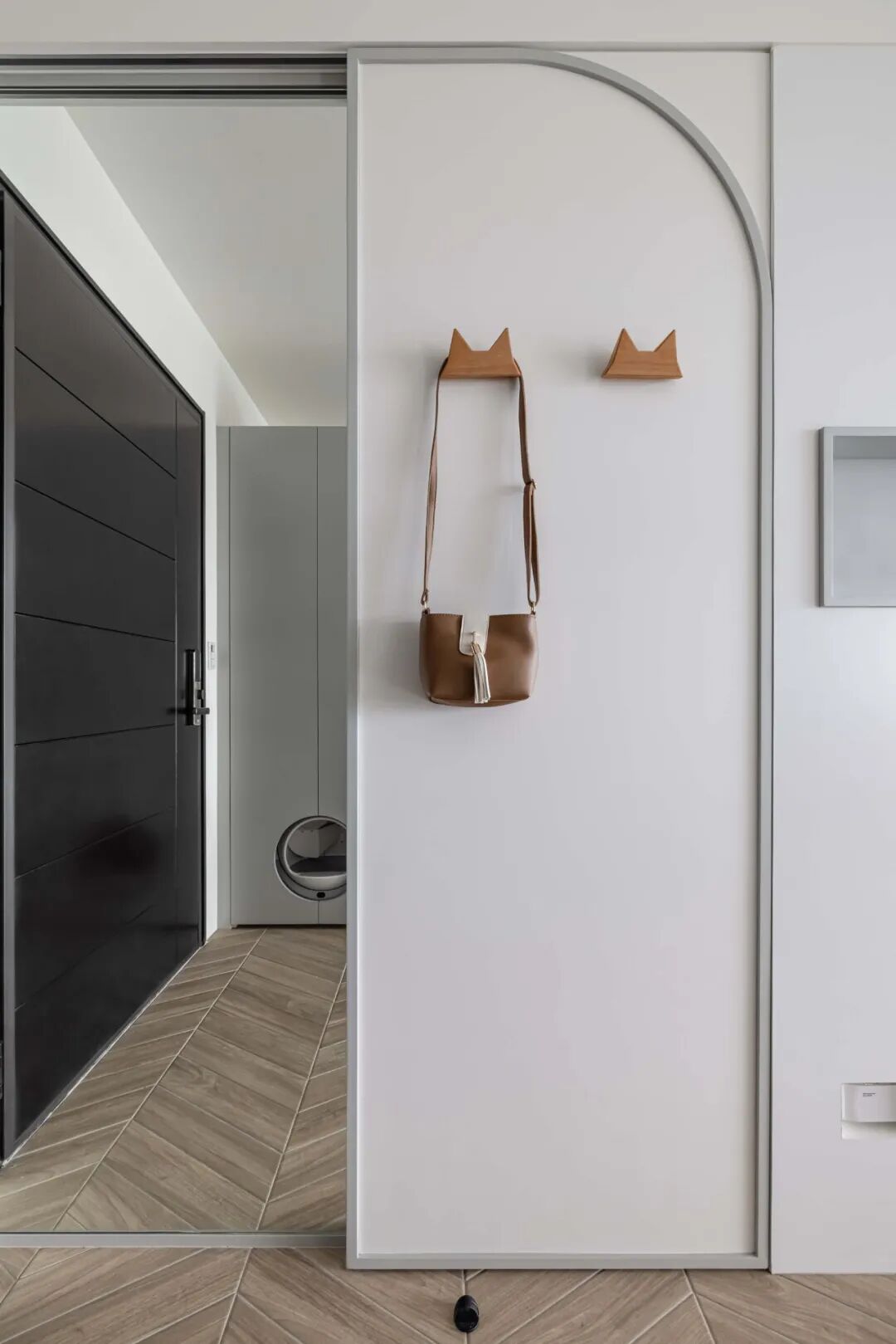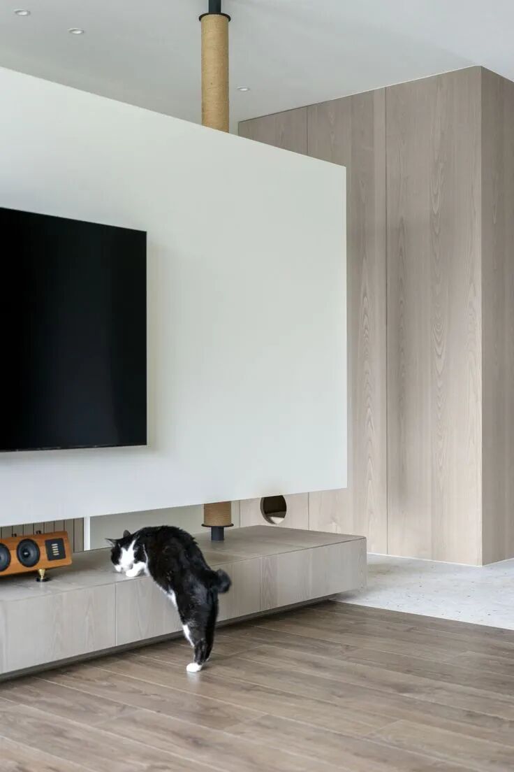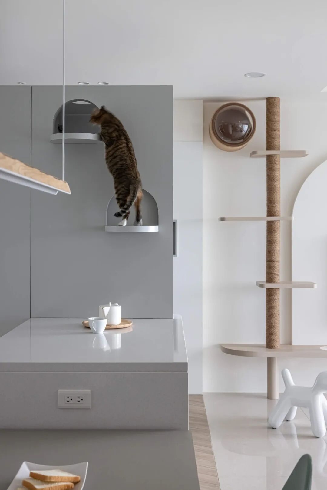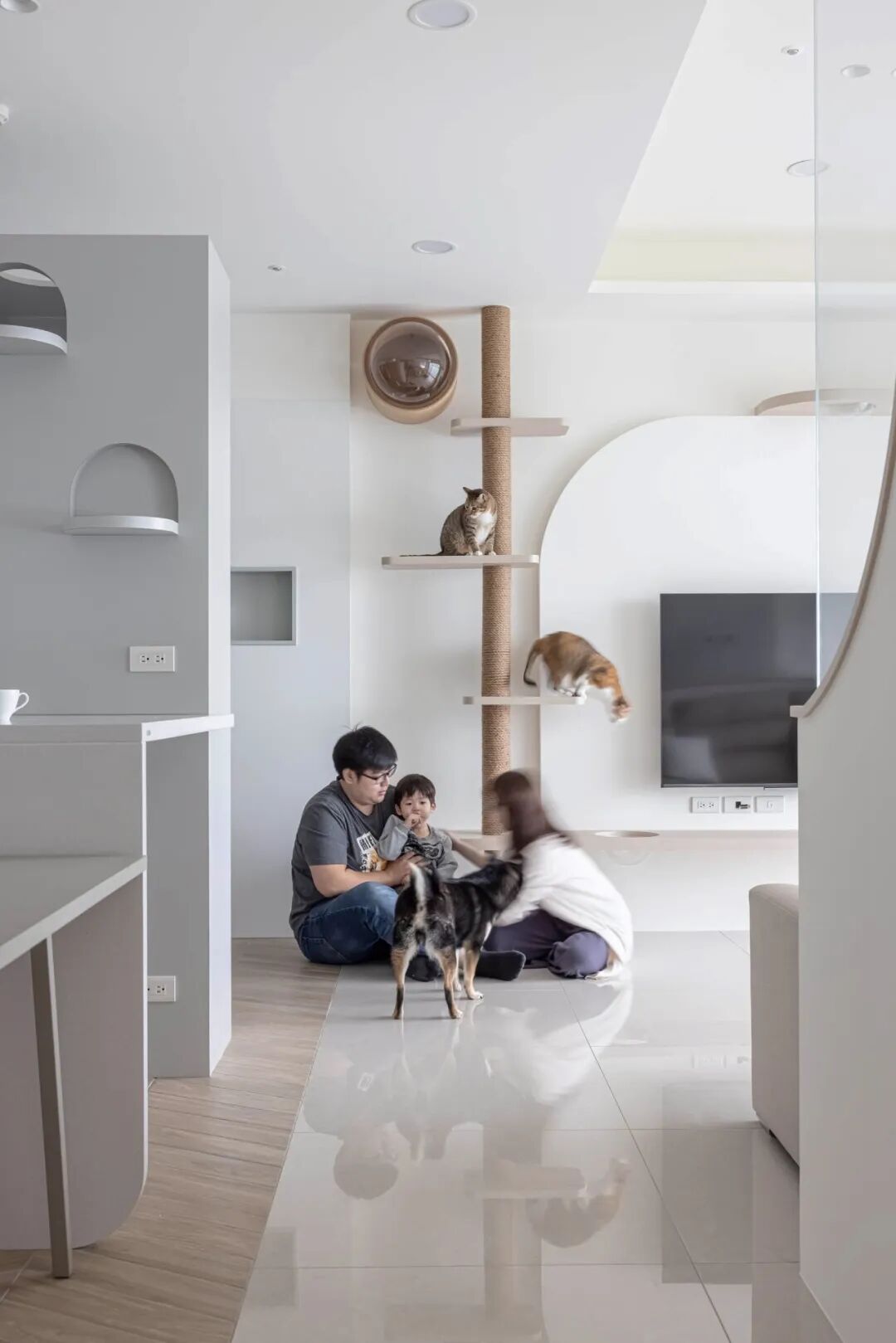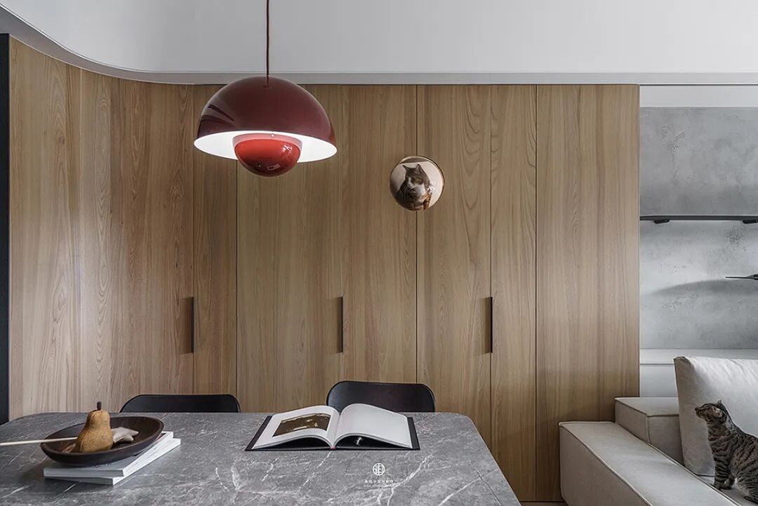 最妙的是那些“长在墙上”的宠物设施——电视墙延伸出的层板书架,自然变成了猫咪的攀爬阶梯和瞭望台;纯白墙面上,嵌着供猫咪穿梭的镂空猫洞和专属步道。这些设计不是后加的玩具,而是住宅结构的一部分,美观又实用,真正把宠物的需求“编织”进了日常生活的肌理里。