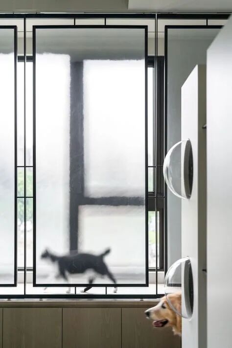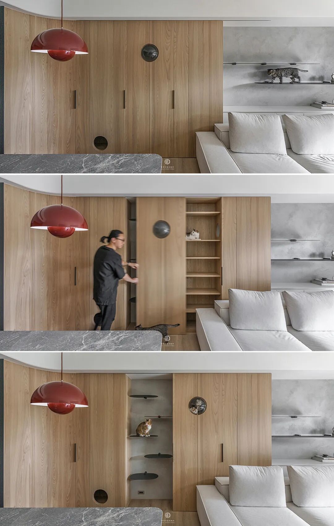 首要法则是设立“冷静区”。设计师利用一道可完全闭合的透明玻璃拉门,必要时能将公共区域一分为二。这让发生冲突的猫咪可以安全地隔开、彼此冷静,快速化解多猫家庭的日常“纠纷”。