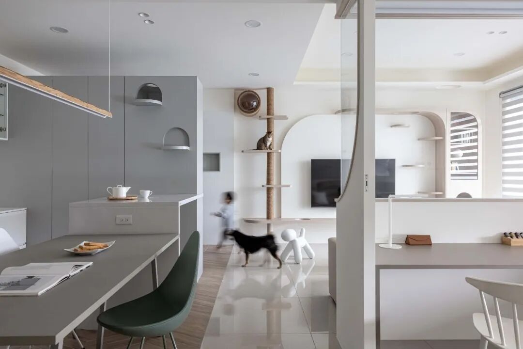 设计师打掉了僵硬的隔墙,让客厅、餐厅、书房彻底贯通。无论大人在沙发休息、在厨房忙碌,还是孩子在书房写作业,一抬眼都能看到毛孩子们在宽敞的空间里自在玩耍。
