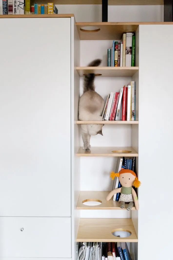 让它成为房子的一部分:把猫跳台和家里的书架、楼梯栏杆这些固定装修结合在一起,让它天生就长在那儿。