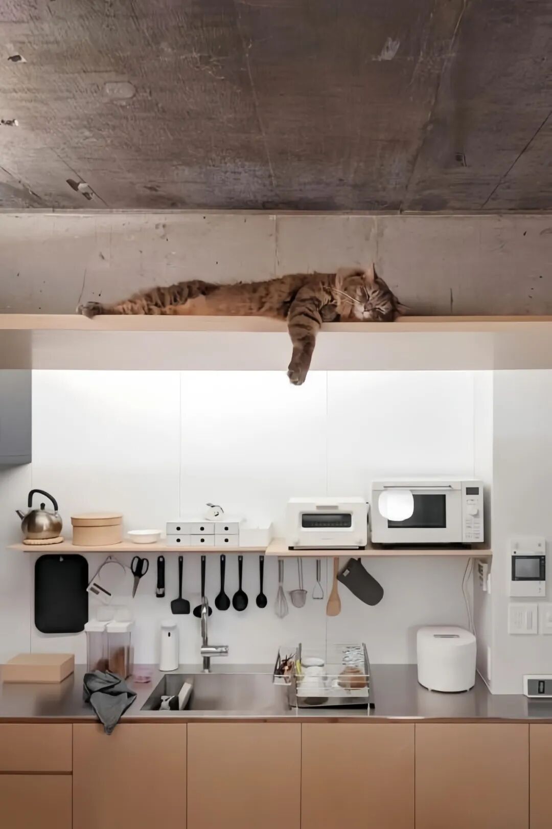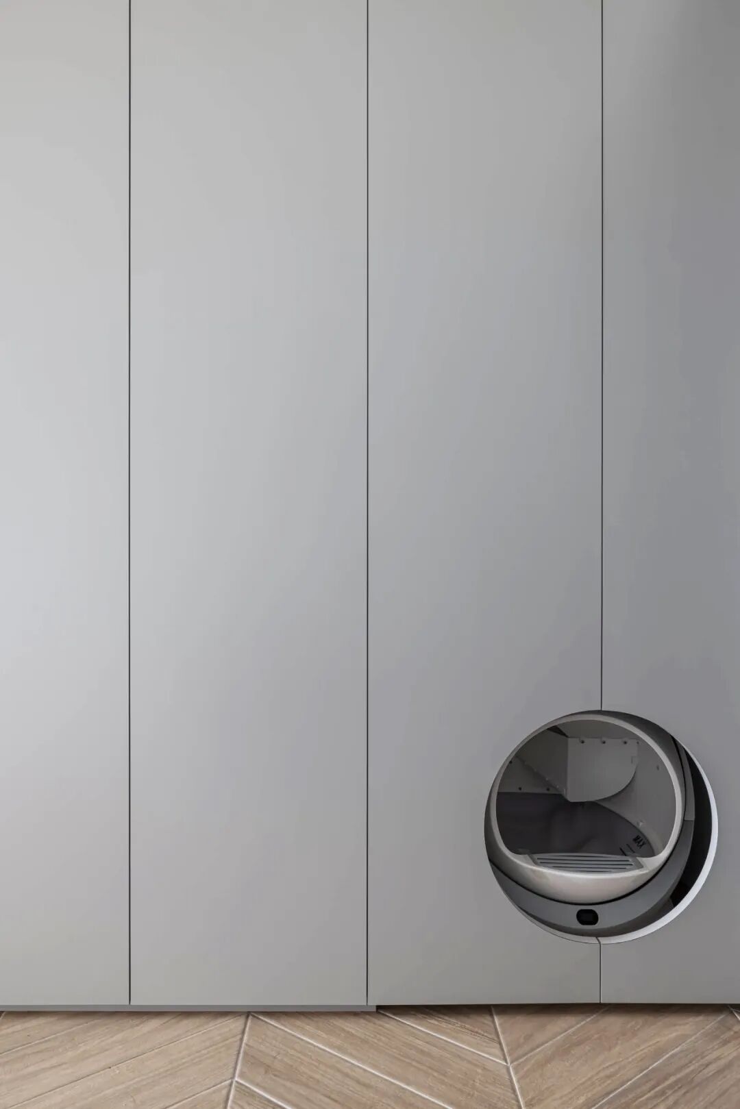 把它们的家伙什儿“藏”好:做定制柜的时候,就提前给自动喂食器、猫粮罐头留好严丝合缝的位置和插座,看起来整洁又高级。