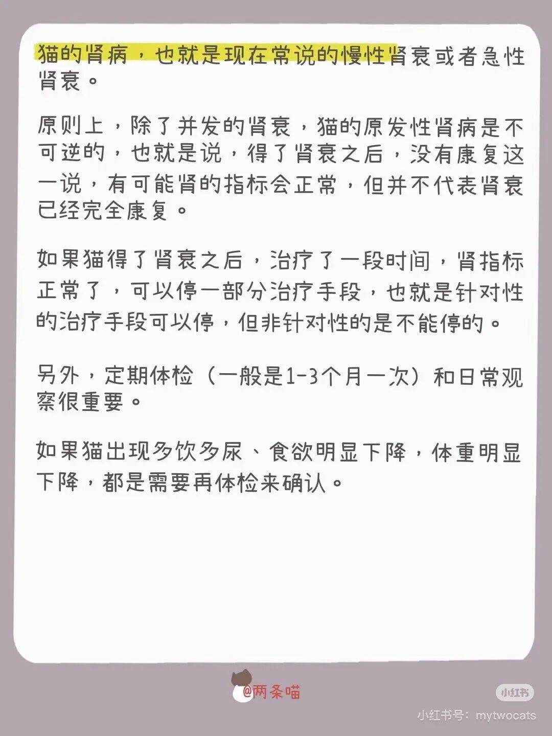 原则上,除了并发的肾衰,猫的原发性肾病是不可逆的,也就是说,得了肾衰之后,没有康复这一说,有可能肾的指标会正常,但并不代表肾衰已经完全康复。