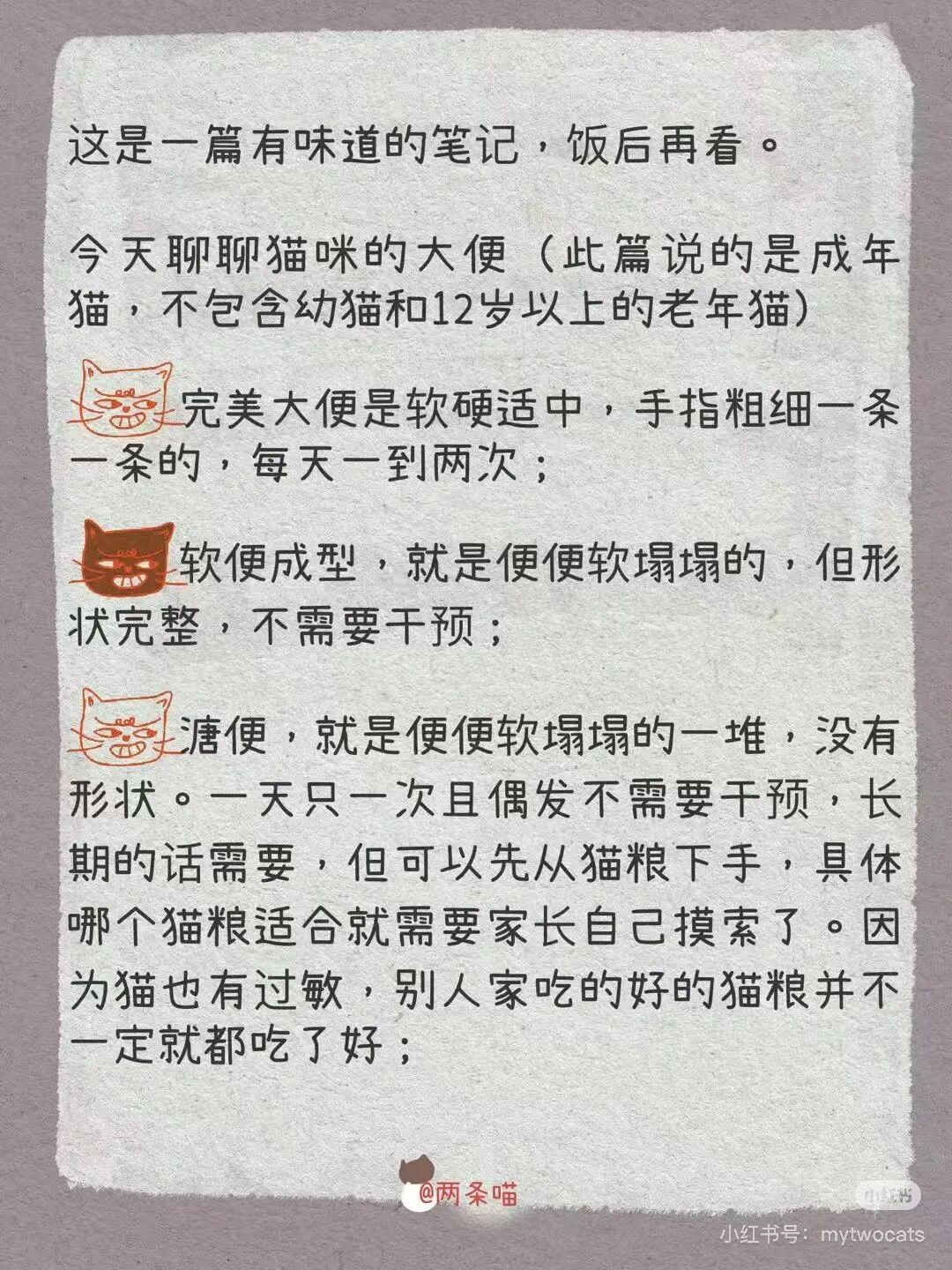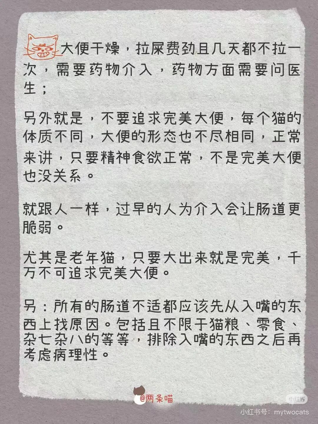 🔹另外就是,不要追求完美大便,每个猫的体质不同,大便的形态也不尽相同,正常来讲,只要精神食欲正常,不是完美大便也没关系。就跟人一样,过早的人为介入会让肠道更脆弱。