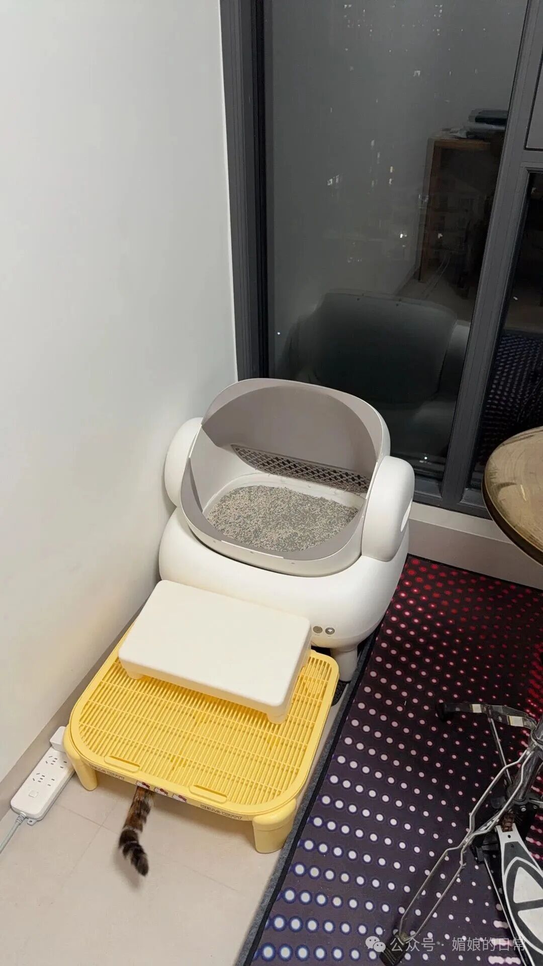 缺点:在自动铲屎的时候会打开集便仓,里面的味道会出来挺臭的,袋子最好还是勤换,我放的位子旁边就是窗户所以还好味道一下就散了。因为是敞开式的,会有普通猫砂盆都有的缺点,猫砂会很容易带出来。还有机器很大很高,比较占位子,幼猫、老年猫和矮脚猫最好像我这样放个接猫砂脚踏(15cm高),这样进出比较方便。