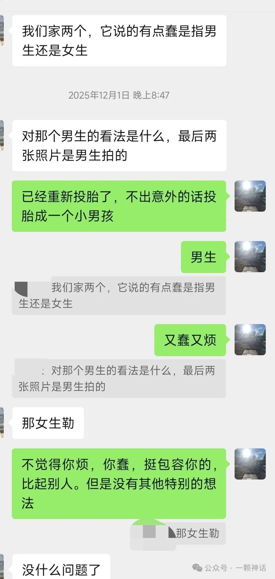 已经重新投胎了,不出意外的话投胎成一个小男孩,男生,又蠢又烦,不觉得你烦,你蠢,挺包容你的,比起别人。但是没有其他特别的想法