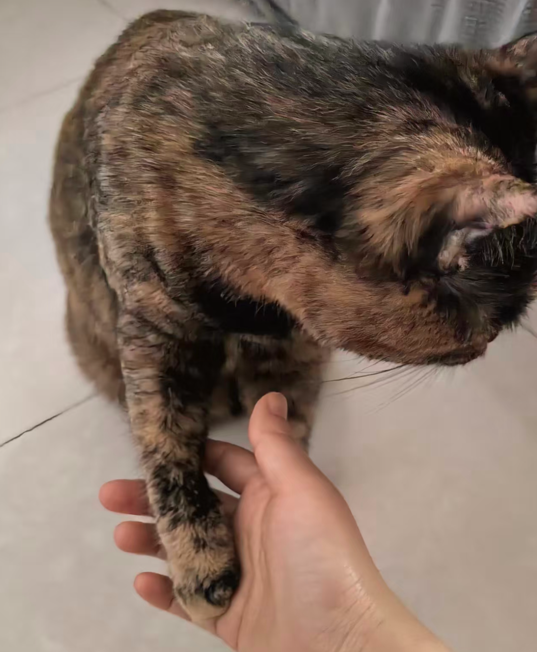 然后摸她爪子的时候,她也不嫌疼,轻轻捏她做检查的时候儿,她也不疼,爪子上也没有扎上什么木刺儿什么一类的东西,啥啥都没有!