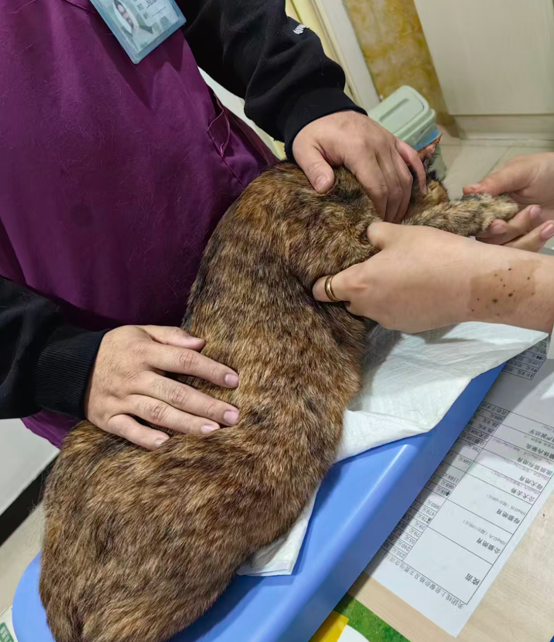 到了医院之后,医生就开始仔细地给小猫做检查。先是检查骨头,然后又看她有没有破皮,再看有没有小虫在爪子那儿有没有叮咬的。总而言之,各种查都查过了。